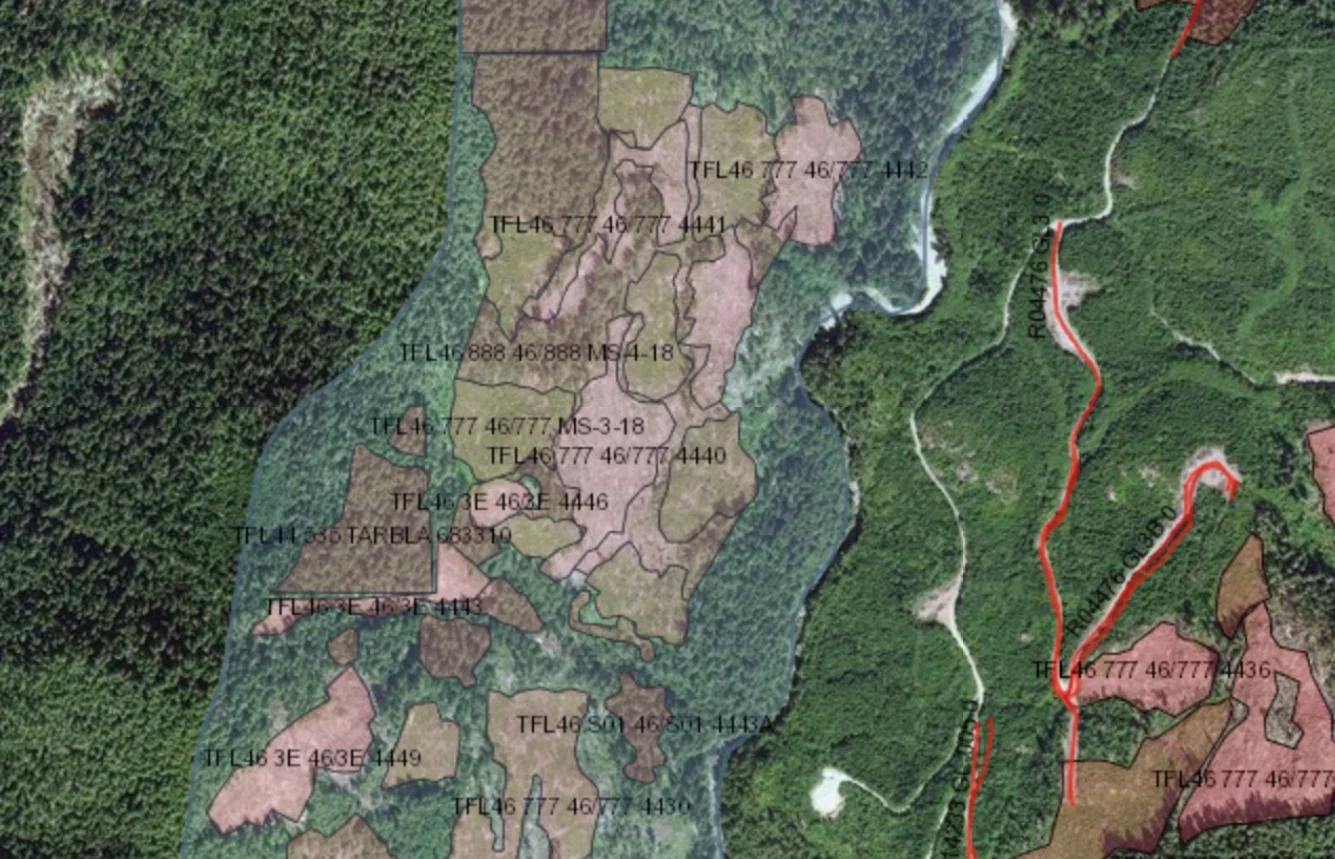 Maia in in the block adjacent to the approved but not logged teal Jones cut block 4424.